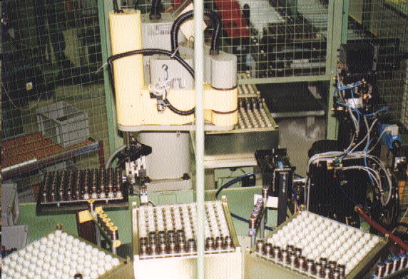 | Sankyo robot picks valve sleeves from infeed pallet : |