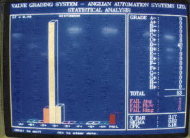 Having gathered the pressure and flow rate data relative to shaft rotation angle ( 6000 readings ), the computer software smooths out the data, discarding any erroneous values, before calculating the differential pressure drop across the valve. This data is also presented on the computer screen. The software analyses the differential pressure curve, looking for two points where the value exceeds 5 bar. The hysteresis of the points are checked and triangulated values calculated to give the precise angle through which the shaft must be rotated to create +/- 5 bar differential pressure drop. This part calculated, part measured angle identifies which one of 16 grades the sleeve belongs to. The robot unloads the sleeve, and palletises it with like graded sleeves - ready for the selective assembly process to begin. Statistical data ( shown in the photograph above right ) gives quality details to the engineers, proving that the system performs within 6 Sigma. |