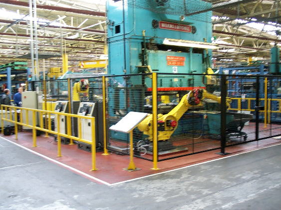 Crosslee PLC, from Hipperholm ( near Halifax - in West Yorkshire ), manufacture a large range of tumble dryers for growing markets in the U.K. and internationally. During the peak season, tumble dryers must be manufactured on a 24 hour per day, 7 days per week basis, totalling in excess of 3000 dryers per day. Hand loading of casing panels, apart from being an extremely boring repetitive job, involves the press operators handling razor sharp materials in an extremely noisy environment. Press operators are also exposed to a high risk of repetative strain injury caused by continually reaching into the press whilst carrying the sheet steel panels. Operator stress, together with failing existing press loading automation working in another cell led engineers to seek a new solution to falling production rates. Robotix, having carried out other work at Crosslee, were asked to look for a reliable method of press loading, capable of producing one panel every 12 seconds - day and night. |